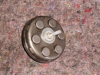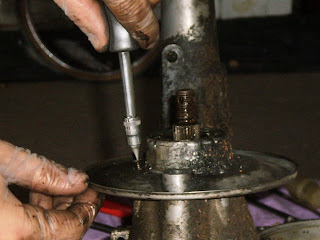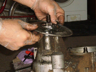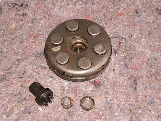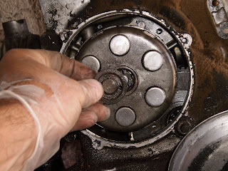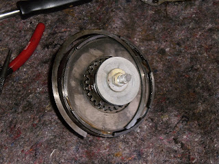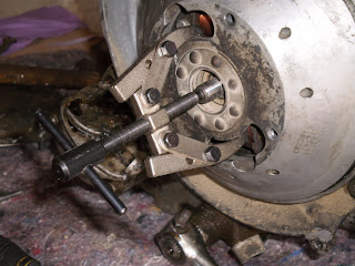 Como se observa aquí se pretendió usar un extractor de cojinetes pequeño (este volante magnétino no está roscado y es necesario un extractor) pero el aluminio del volante se rajaba, así que tuve que ir a un taller para realizar la operación con un extractor en condiciones (vamos, más grande para que el volante fuera abrazado desde más abajo y más cercano al eje)...