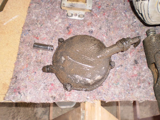 Según los manuales de taller ahora habría que proceder con el embrague, primeramente quitamos la tapa, sencillo, tres tornillos y está fuera, ya volveremos con esta tapa...
