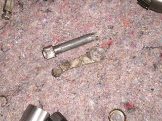 A continuación desmontamos el plato portazapatas, lo primero que hay que hacer (una vez quitadas las zapatas, ya habréis visto que el motor no tenía la zapatas montadas) es quitar la leva de freno, quitando el pasador que une las dos piezas...
