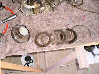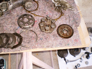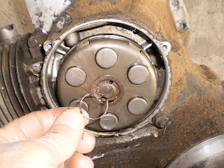 Y ya podemos ver el embrague extraído, con la chaveta que lo fija al cigüeñal, el útil para sacar la tuerca almenada y la corona-arandela que impide el giro de la tuerca una vez apretada...