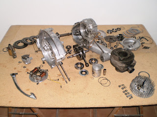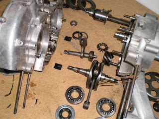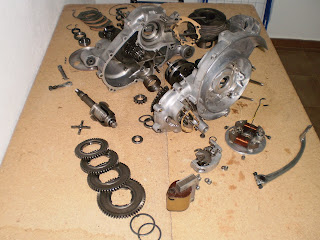 Como veis, están casi todas las piezas del motor, falta el volante magnético, las tapas, carburador y escape, pero me parece que no importa demasiado, las fotos son bastante ilustrativas, aquí tenéis los rodamientos del cigüeñal y los retenes con la chapa, las gomas de apoyo del sector dentado de arranque, el rodamiento de rodillos del cambio...