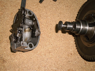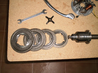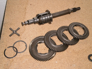 Vamos a montar el eje primario de la caja de cambios, bueno, no estoy seguro de que se llame así, pero es el que recoge el movimiento del tren fijo y lo transmite directamente a la rueda trasera, como siempre, presentación de las piezas, al final se decidió sustituir la cruceta del cambio, aunque no estaba muy gastada, su relativo bajo precio (en torno a 12 euros, para los nostálgicos 2000 pesetas) y el tener el motor abierto, hacen recomendable el cambio, así que...