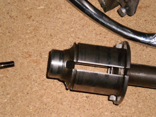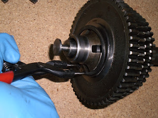 Vamos allá, lo primero es quitar el tornillo que sujeta la cruceta al empujador, dos precauciones, la primera es no dañar el alojamiento donde irá la palanca del selector de marchas, la segunda y más importante, es que la rosca de este tornillo, va al revés, a izquierdas, y en nuestro caso, las llaves fijas eran más gruesas que la ranura para sujetar el tornillo, así que tuve que apañarmelas con unas piezas de metal y un tornillo de banco...