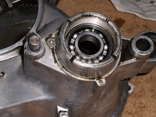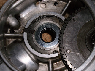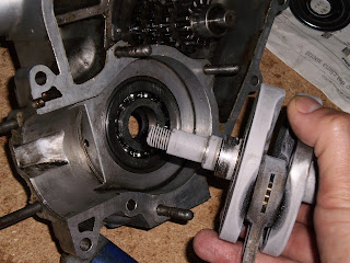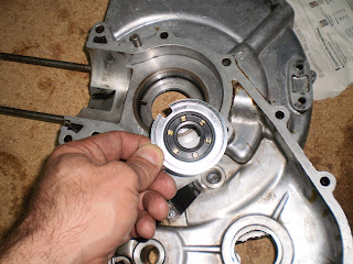 Vamos rápido que llego tarde... Aquí estoy otra vez, lo que traigo es bastante parecido a lo anterior pero pretendo mostrar tanto como pueda, así que allá voy. Colocaremos a continuación los rodamientos y retenes del semicárter del lado del volante magnético, comenzamos por el retén del cigüeñal, de igual modo que hicimos para el otro lado, presentamos, cuidando de que la hendidura queda en linea con el orificio de su alojamiento para permitir un mejor engrase...