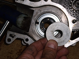 Y colocamos el rodamiento con ayuda de la arandela que se puede ver en la parte superior derecha de la foto, recordamos que para facilitar la tarea, el rodamiento ha estado en el congelador para que el frío lo contraiga...
