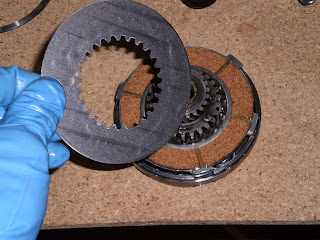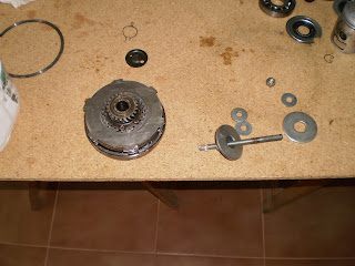 Los discos van alternando, de corcho, engranados con la campana y lisos, engranados con el piñón interior, cuando tengáis un embrague de recambio, tal vez lleve un número distinto de discos, lo que debéis tener en cuenta es el grosor total de los discos, en este caso, con los discos de recambio, no quedaba juego para que los discos se desacoplaran, y quitar un disco (una pareja, de corcho y liso) lo dejaba demasiado delgado, asi que tiré por la calle de enmedio, dejé los discos lisos del viejo algo más gruesos y sustituí únicamente los discos de corcho...
