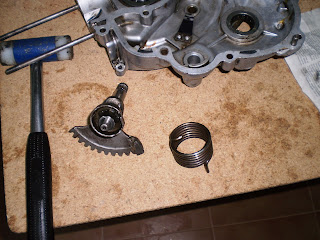 Colocaremos a continuación el eje del pedal de arranque, ya pusimos las gomas de tope y la junta tórica para retener el aceite en el cárter...
