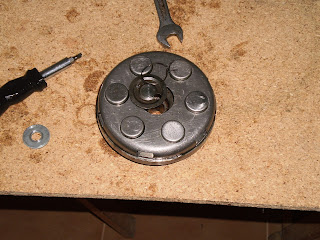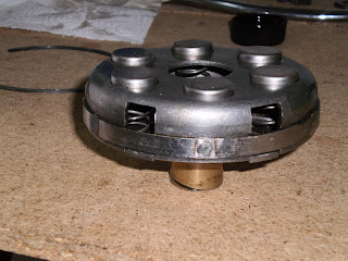 Aquí ya está colocado, en este punto podemos comprobar cómo los discos de corcho deslizan sobre los lisos (el embrague está comprimido, como cuando cojo la maneta) y al soltar las tuercas el conjunto se acopla (la maneta está suelta y el movimiento se transmite del motor a la caja de cambio)...