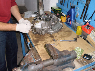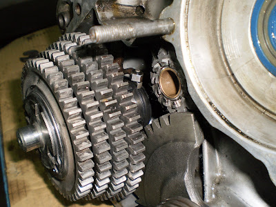 Al turrón: me he liado ya con partes del motor, como no sabía por dónde iba a empezar me he llevado los rodamientos y el cigüeñal que tenía en el congelador de casa ¿? (el frío hace que se contraigan y entren mejor en sus alojamientos); al final no he hecho nada con ellos. En cambio he empezado a montar el grupo de engranajes del cambio y el embrague.