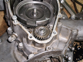 A continuación hay que presentar el piñón para hacerlo engranar con el engranaje elástico, metido en su eje y coincidiendo con la ranura de la chaveta en el piñón. Para hacer esta operación, habrá que girar la corona del embrague hasta situar la hendidura de mayor tamaño hacia el semieje del cigüeñal para tener más sitio y poder bajar el piñón. (hay que ver lo que facilita las cosas esta hendidura...)