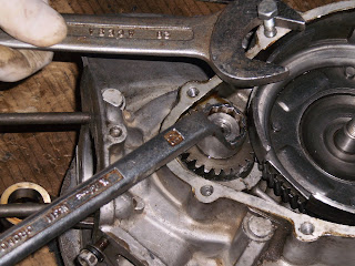 Ahora podemos ya enroscar la tuerca, para apretarla debemos bloquear el giro del cigüeñal, pero lo haremos de manera indirecta, es decir, bloquearemos no desde éste sino desde la corona del engranaje elástico. Observad cómo se bloquea el giro usando un tornillo de la tapa del embrague y una llave fija. (Cuando lo aflojé tuve que bloquear desde el otro lado)
