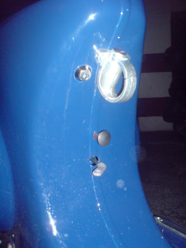 Este es el detalle del gancho portabultos con cerradura, y al lado lleva el cortacorrientes de llave. La verdad es que en un principio la zona era genial, hasta que me di cuenta que choca con la caja portaherramientas, la cual, deformare un poco con un decapador de calor.