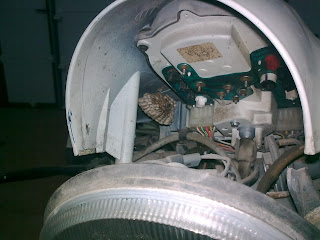 Ahora quitamos la tapa del manillar, para ellos sacamos los 8 tornillos desde la parte inferior y podemos levantar la tapa, una vez arriba y para hacer más cómodo el trabajo sacamos el faro, quitando los dos tornillos laterales (visibles sólo al levantar la tapa), el inferior (visible desde fuera, sirve para regular la inclinación del proyector) y desconectando la clavija con los cables.