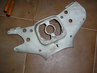 Así queda el cabezón sin la tapa, el manillar y la tapa inferior de plástico (mando de cambio de marchas doblado, sustituir, resto buen estado, limpiar y montar, lijar, pintar y montar).
