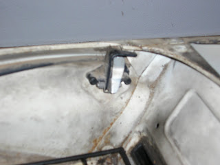 Por último, de momento, pasamos a desmontar el cajón tras el escudo, un tornillo lo sujeta al chasis por la parte superior en el interior, y lo quitamos. para desmontar el cajón hay que quitar los embellecedores del escudo, parecen de plástico pero en realidad son perfiles de aluminio muy fino con plástico sinterizado, hay que actuar con mucho cuidado para quitarlos, no creo que exista ese repuesto, así que de momento habrá que tratar de reutilizarlo (buen estado, uno se ha partido, limpiar y volver a montar). Quitado el embellecedor quedan al descubierto las 8 tuercas que sujetan el cajón, una vez desenroscadas el cajón sale fácilmente hacia atrás, ¿fácilmente? parece que habrá que quitar la cerradura antes, así que el cajón no está fuera, aunque si suelto.