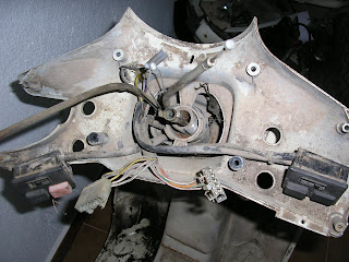 Desmontamos la nariz, en nuestro caso sólo sacamos media nariz, la parte inferior, puesto que está partida, quitamos los dos tornillos inferiores y fuera (partida, sustituir). Queda al descubierto un montón de cables eléctricos, más de los que debería haber, pues según recuerdo, a esta moto le montaron en su día una alarma que le quitaron, ya se verá si se quitan los cables que sobran o se dejan.