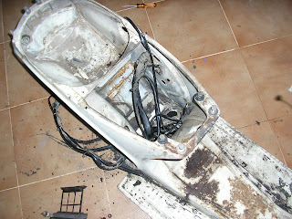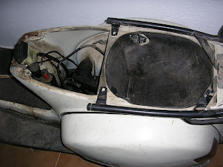 Vamos con la segunda parte de la primera entrega, no tuve tiempo de subirlas en su día. Lo primero que se hizo fue quitar el sillón de la moto, 4 tornillos de los cuales dos además sujetan el depósito de gasolina, que qutando los dos de atrás sale, aunque no demasiado fácil, hay que tener cuidado con el depósito de líquido de frenos y quitar antes el cable eléctrico del aforador de combustible y el macarrón del respirador del depósito. Para sacarlo se salió el macarrón de la gasolina, habrá que montarlo con él puesto y montarlo después en el carburador. Una vez retirado la moto queda así, en el hueco del casco existe una especie de gomaespuma que en nuestro caso está bastante estropeada, imagino que será dificilísimo encontrar el repuesto, así que trataré de recuperarla y si no es posible me tendré que invertar algo...