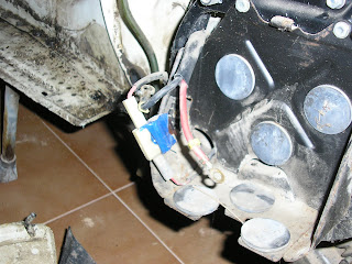 Primera pieza a reparar, el portafusible. Conviene hacer esquemas y dibujos de cómo van conectados los cables (la idea para esta restauración es dejar la instalación eléctrica en el chasis, puesto que funciona perfectamente). También está bien lo de hacer alguna foto como ésta que véis aquí. Quitamos las conexiones y sacamos el plato soporte.
