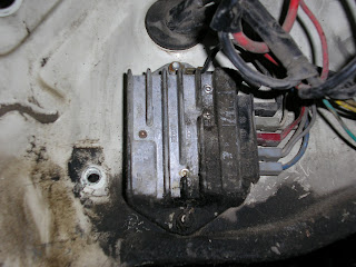 Vamos con el regulador, antes de desmontar, anotamos los colores de las conexiones, un par de tuercas lo fijan al chasis, pero no podremos sacar la instalación hasta extraer el filtro de aire en el interior del chasis.