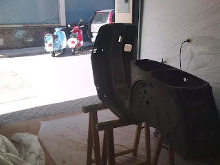 Vamos a poner algo en alguna de las fotos: En la primera se puede ver el chasis ya reparado, aunque no se ve el detalle, es cuando traje el chasis del taller, la verdad es que han hecho un buen trabajo, el mecánico que lo hizo no lo conocía de nada, lo encontré por casualidad, buscando a un soldador que me recomendaron y resultó que preguntando por él, aquel me comentó que le gustaban las motos, las vespas y demás... vamos, que se quedó con la faena.