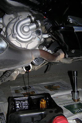 Y tambien comentar a la peña que si sacan el aceite con el caballete central puesto tendran dificultades para poner un recipiente para recoger el aceite usado, ya que este colisiona con el caballete.