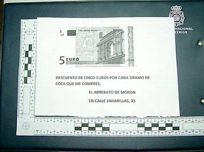 La Policía Nacional ha detenido en Morón de la Frontera (Sevilla) a Juan C.M., con antecentes policiales, y a su mujer, María del Carmen V.M., como autores de un delito contra la salud pública, tras ser localizados repartiendo octavillas con el lema: 'Descuento de cinco euros por cada gramo de coca que me compres. El arrebato de Morón, en calle Zaharillas 39'.