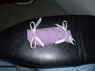 Finalmente podemos cerrarla con un par de cintas, en este caso la elección fue de mi suegra, con cinta de raso malva a juego con la tela de la bolsa, un primor, vamos.