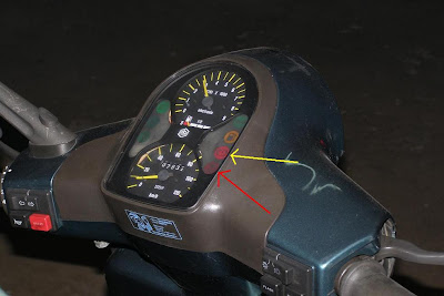 Me habían comentado que la luz que marco con una flecha amarilla es de la batería... Como la COSA tiene la batería jodida desde hace 5 ó 6 años la arranco a pedal y siempre esa luz está encendida..., que en cuanto cambiase la batería por una nueva se apagaría... El caso es que el otro día le puse a la COSA las pinzas para ver si arrancaba con el botón de arranque y si lo hizo a la primera, pero la luz continuaba encendida ????????? Así que y me hace dudar.