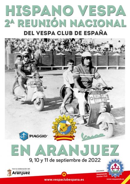 Los próximos 9, 10 y 11 de septiembre de 2022, el Vespa Club de España va a celebrar en ARANJUEZ el II HISPANO VESPA, organizado por VESPEANDO SCOOTER CLUB.