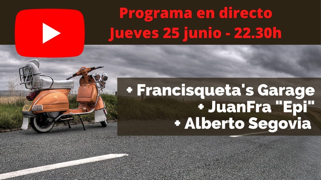 El jueves 25 de junio de 2020, me invitó Jordi Linares para hablar sobre lo que ha sido Vespania y las 10 Vespaniadas. Estuve en directo en el programa con el artista JuanFra «Epi» y con Francisqueta´s Garage, que hace obras de arte mecánicas con las Vespas. Espero que os guste. Todos los jueves a las 22:30 tenéis un programa en directo. (En verano de vacaciones eso sí)